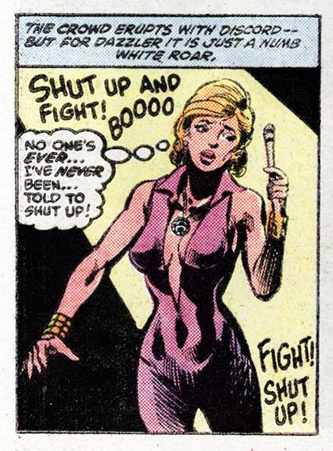 This fear typifies how outspoken women (particularly performers) are treated when they speak up. Last year, fifteen years after the Dixie Chicks spoke out against George W. Bush and two years after efforts to #BoycottBeyoncé, another “shut up and sing” narrative emerged as Taylor Swift shared her political beliefs on Instagram. Such narratives—in which celebrity entertainers are criticized for using their platforms to engage in political discourse—have become a recent subject of scholarship ranging from feminist studies and film studies to music studies and international relations. In the case of Dazzler, her fictional “shut up” moment arrived in Beauty and the Beast (1984), when she was recruited to perform in a gladiatorial underground mutant theater. There, she chooses to sing for her audience instead of fight other mutants, which leads to calls for her to “shut up and fight”—a phrase that calls to mind the “shut up and sing” rhetoric leveled at contemporary women performers and recent demands that black athletes (e.g. LeBron James or Colin Kaepernick) just “shut up and play.” The implicit message, of course, is that they should not buck the system. Indeed, their status as entertainers and athletes apparently disqualifies them from fighting back; the argument is that their platform entitles them to fame and nothing more. Such stories remind us not only that silence cannot protect, but that speaking up will be seen as a threat by those who benefit from oppression.