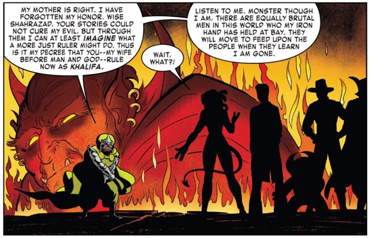Caliph Doom cedes control of his domain to T.J. having learned something of justice from her stories in the role of Shahrazad [from Exiles vol. 3, #10 (January 2019)]