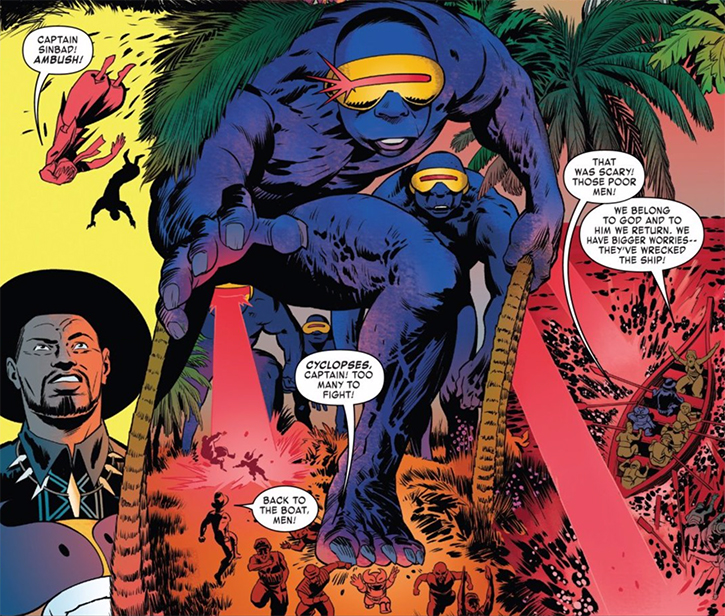 KIng and Wolvie as Sinbad and his barber face giant blue cyclopses with visors referencing Scott Summers’s from the X-Men (from Exiles #9)