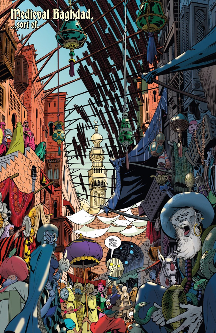 Rodríguez’s Exiles are, to the reader at least, visually distinct from the characters of One Thousand and One Nights for whom they are mistaken, and so, despite being recognized as characters from Shahrazad’s stories, the Exiles cannot be accused of appropriating their fashion, which often stands in for ethnicity and culture. They aren’t dressed like citizens of medieval Iraq. (Unfortunately, the cover to Exiles vol. 3, #9 by David Nakayama deviates from this distinction). In addition to the Tallus and a choker, Blink wears a belted leotard under a jacket with coattails and thigh-high socks in cavalier boots, all different shades of green. Nate wears his Iron Lad armor with and without his helmet. Valkyrie wears her own Asgardian armor, Becky Barnes and Peggy Carter keep their WWII uniforms, and King looks more like a cowboy (which he is) than a sailor. Wolvie—a character that looks and acts like he stepped out of an issue of What If? that imagines the X-Men as Muppet Babies—would stick out in a contemporary Iraq, much less the mythical/mystical/medieval Baghdad in which Exiles #9 and #10 are set. It is important that the Exiles are distinct in appearance because they are not meant to be representations of the people whose stories are being told through them.