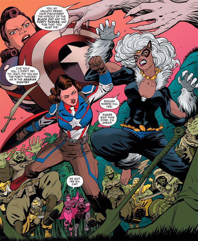 Peggy Carter as an alternate-reality Captain America vs. a Medieval Baghdad version of Black Cat (from Exiles vol. 3, #9)