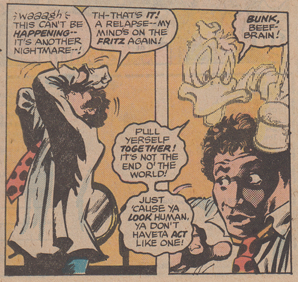While I have not mentioned it much in this installment, Gene Colan’s art continues to be fantastic and when his work is inked by one of the best in the business—Klaus Jansen—it is even better. I do find myself frequently complaining about how the panel layout leans towards the askew and non-standard, but that is mostly because of the difficulty of scanning individual panels for this project. Within the context of the comic’s absurdity and confusion, the layout—with overlapping and/or strangely-shaped panels—helps to evoke the feeling of being embroiled in weirdness.