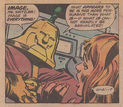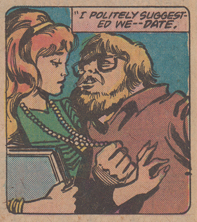 The comic does do a good job of juxtaposing Dr. Bong’s perception of himself throughout his story with what we see illustrated in the panels. For example, despite Bong’s description of approaching Bev with “consummate gentlemanliness,” the panels depict him blocking her way down the stairs and grabbing her by the necklace to pull her close to (in his words) “politely” ask for a date. Simultaneous to this critique of masculinity, the comic is also critiquing tabloid journalism and the primacy of image in evaluating reality—an idea that is even more true today that it was in 1977. Dr. Bong’s claim to Bev that “Image is everything! What appears to be is far more persuasive than what is…The dominance of style over substance, form over content” might be an expression of the postmodern condition and relation to reality but is also an appropriate description of this very comic book title, which tries so hard to be a social satire but doesn’t really have much of any true profundity to say about the topics it tackles save for the satisfying affect of snarky dissatisfaction. And given the repetition of the scenes or descriptions of characters in this series who end up representing just that kind of “too-cool-for-school” attitude, I feel confident in my evaluation.
