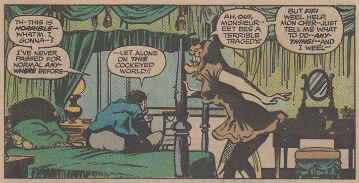 Despite being threatened by the other men in Bev’s life, issue #17 ends with Dr. Bong explaining he plans to put Howard in his “evolvo-chamber” to transform him into something closer to human. Bong’s plan is to breed Howard with Fifi, a female duck evolved into a duck-woman who wears a French maid’s outfit with fishnet stockings and speaks in an outrageous French accent for some reason. It is not clear what Bong hopes to accomplish with this plan (or why Fifi can’t be bred with the duck man that rescued Howard and Bev from quicksand in issue #15). In issue #18, however, the procedure goes awry and rather than be transformed into even more of a duck-man than he already is Howard is transformed into a human (leading to the fantastic homage to Amazing Spider-Man #50 and “Spider-Man No More” on the cover of #19).