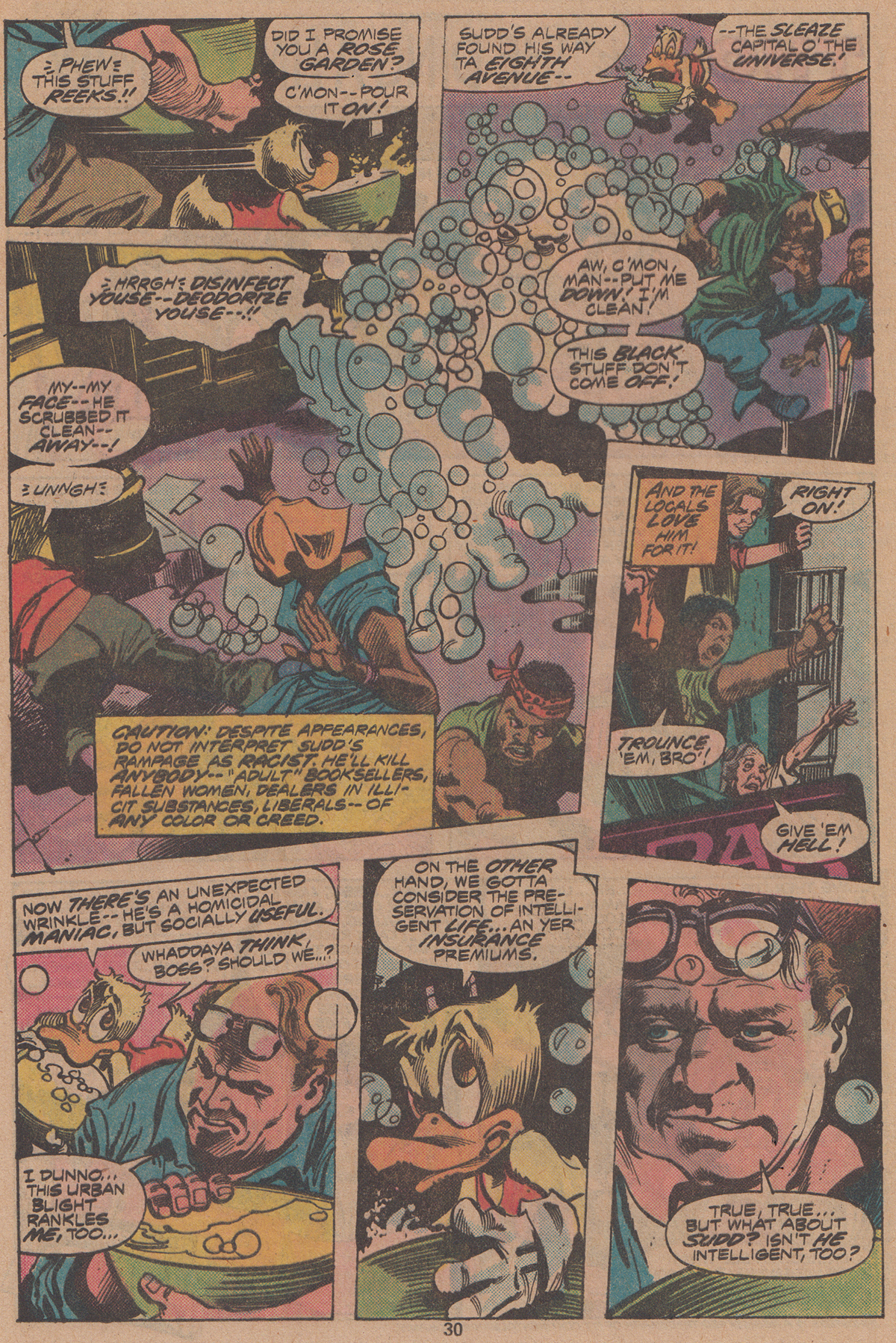 In addition, the residents of the neighborhood are depicted cheering on the monster’s homicidal cleansing from their windows. Howard even second guesses his efforts to stop Sudd, explaining to his boss, “Now there’s an unexpected wrinkle — he’s a homicidal maniac, but socially useful.” The boss agrees, saying that “urban blight rankles [him], too…” Howard decides to go through with dousing Sudd with his vinegar and lemon juice antidote anyway and it works—Sudd dissipates—but Howard complains that now he is a hero “ta every degenerate on the block.” Subsequently, the presumably law-abiding neighborhood folks (all depicted as white) get so angry that the duck stopped the “clean-up,” they attack him with brooms and a hatchet, complaining that he sabotaged “the first effective clean-up campaign in [the] neighborhood’s history!!!” In other words, the “normal people” were fine with indiscriminate murder as a solution to urban blight.