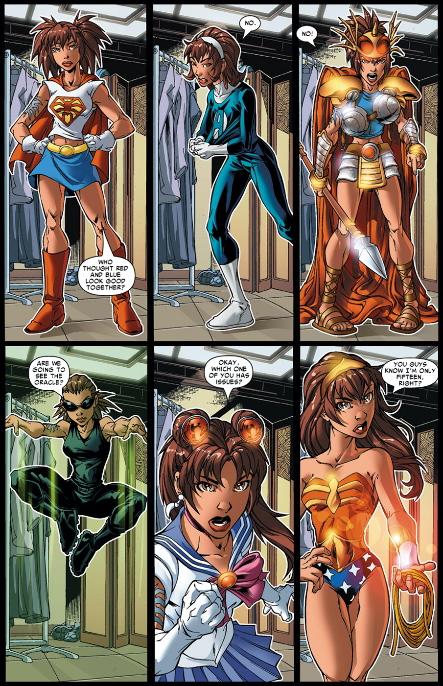Araña tries on multiple superhero costumes courtesy of WebCorps. [from Amazing Fantasy vol. 2, #6 (January 2005)] (Click to enlarge)