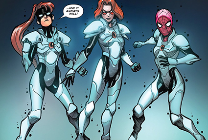 An image of Spider-Girl (right) with Spider-Man and various other spider-women. [from Spider-Geddon: Spider-Girls #1 (December 2018)] (words by Jody Houser; art by Andrés Genolet, Triona Tree Farrell, and Joe Caramagna)