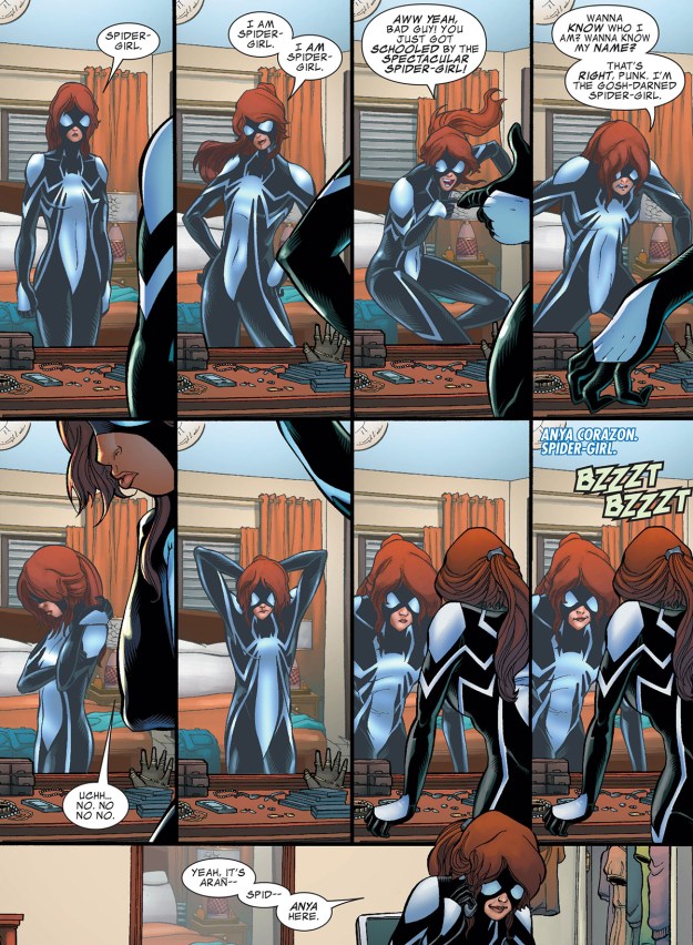Despite this move toward assimilation, however, Araña’s storyworld is never fully untethered from her Latinx identity, even if that connection is sometimes subtle or unintentional. This is particularly true as Anya continues to find herself caught up in fights tied to toxic whiteness. It is perhaps no accident, then, that she ends up befriending Rikki Barnes (aka Nomad) during the brief Nomad in Conjunction feature (found in Captain America #602 to #605)—a woman whose brother nearly had her killed due to his ties with a white supremacist organization. Together (as one of my favorite head-canon ships!), the two of them also team up with Benito Serrano (aka El Toro) in Young Allies (2010), which requires Anya to be more explicit about her Latinx identity—even as she assumes the moniker of Spider-Girl. The centering of Latinx concerns in Young Allies has already been commented on by Jennifer Margret Smith, so I will not rehash that argument and I will simply note that the story explicitly engages with Benito’s undocumented status, Anya’s work as a translator, and the politics of bilingualism. Yet even as Latinx issues are foregrounded in Young Allies, Anya struggles with her new, depowered identity as Spider-Girl. The final issue of that series pays homage to Anya’s first costume session in a page laid out in similar fashion. Yet instead of vehemently rejecting the costumes of white superheroes as before, Anya wears the Spider-Woman costume she inherited from Julia Carpenter—an outfit that also inspired Spider-Man’s symbiote costume. As she answers the phone in the last panel, she is unable to say either of her superhero names: “Yeah, it’s Arañ– Spid– Anya here.” This moment speaks to an uncertainty about her status—particularly in relation to whiteness. Still, unlike the predominantly white “Golden Age” heroes, who fought the threat of white supremacy in the form of Nazis, we can continue to read Anya as a Latinx character in terms of how she functions in a world where white supremacy takes the form of WASPs, anti-Mexican rhetoric, and immigration concerns.