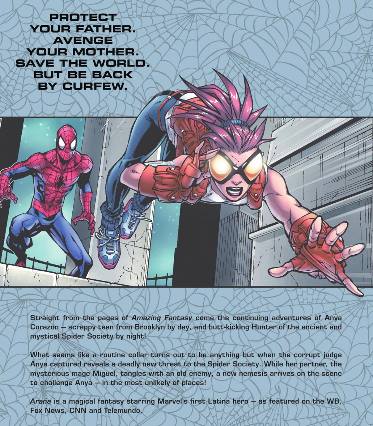 Anya’s carapace symbolically marks her as a member of the Tetrablemmidae family of spiders, whose members are known for the toughened layers of exoskeleton that cover their body. Often referred to as “armored spiders,” these spiders developed exoskeletons to protect themselves from the aggressive predatory wasps that hunt them. Such wasps are known to swoop down onto their prey and deliver a paralyzing sting that leaves spiders immobilized. For Araña, the threat of wasps materializes when she joins The Spider Society and gets caught up in a battle with The Sisterhood of the Wasp. Whereas Peter Parker’s rivalry with wasp-figures is told primarily through the idea of wasps as entomological creatures that have a predator-prey relationship with spiders, Anya’s narrative invites us to reckon with wasps as WASPs (i.e. White Anglo-Saxon Protestants). And, although Anya was not technically Marvel’s “first Latina hero,” she was promoted as such in the media and on the back cover of digest editions of Araña: The Heart of the Spider (2005). By drawing attention to her perceived firstness, Marvel not only erases earlier Latinx representation (e.g. Bonita Juárez, aka Firebird, or the various incarnations of White Tiger) but invites a racialized reading of WASPs by drawing attention to Anya’s status as not just a superhero or spider-person—but as a Latina. Readers also learn that The Sisterhood of the Wasp came to the Americas from Europe long ago as a violent criminal group—a description that maps easily onto historical narratives about WASPs and their colonizing practices.