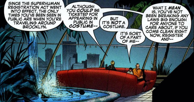 This is where her exoskeleton becomes an important site of inquiry and opens up opportunities to reconsider Anya’s Latinidad, her proximity to whiteness, and narratives of assimilation. While claiming Araña’s exoskeleton as a commentary on Latinidad may seem like a significant interpretive leap, that argument is rendered plausible as her story continues beyond the Amazing Fantasy (2004) and the Araña (2005) solo series—particularly as she gets pulled into a Civil War storyline. In Ms. Marvel vol. 2, #7 (2006) we find Carol Danvers (aka Ms. Marvel) talking to Anya and her father about the need to comply with the Superhuman Registration Act (SHRA). When Carol tells Anya, “you could be ticketed for appearing in public in costume,” Anya replies by referencing her exoskeleton: “But it’s not a costume. It’s a part of me.” While space does not allow a detailed exploration of how these types of registration acts in the Marvel universe echo narratives about ethnic control in the United States, I will note that this exchange focuses on Carol’s concerns about how Anya looks in public—a comment that cleanly maps onto contemporary narratives of racial profiling and Latinx discrimination.