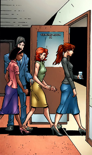 An example of how Anya (right), Rikki (center), and Rocky (left) are colored in the Spider-Girl series. [from Spider-Girl vol. 2 #2 (February 2011)] (art by Clayton Henry, Ray-Anthony Height, Walden Wong, Jerry Paris, Clayton Henry, John Livesay, Chris Sotomayor, and Joe Caramagna)