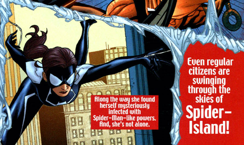 The assimilationist politics here are not strictly promotional, but the result of Anya losing her exoskeleton. Anya is reinvented as Spider-Girl, a move that is initiated when she is given Julia Carpenter’s costume in Grim Hunt (Amazing Spider-Man #634 to #637) and made official when she chooses to identify as Spider-Girl in Young Allies (2011). Through this transition, she is depicted as a “typical” Marvel spider-hero in terms of costume, signature moves, and narrative (which now includes the loss of both parents—a common trope among superheroes). In Grim Hunt, her story is woven into other spider-verse narratives, and she later regains spider-powers in the Spider-Island (2011) event, although they are not her powers and do not include an exoskeleton. Instead she is given normative spider-powers, which are referred to as “Spider-Man-like powers” on the inside cover of Spider-Island: Spider-Girl #1 (2011). Spider-Island thus represents another moment of assimilation for Anya, as it literalizes the indistinguishability of spider-powers across characters and reimagines her powers within white-normative structures. This move is a precursor, perhaps, to “All-New, All-Different Marvel” and how it demonstrates the limits of representational justice. As Johnathan Flowers argued in “Decentering and Recentering in the Field of Comics” at Cartoon Crossroads Columbus in 2016: