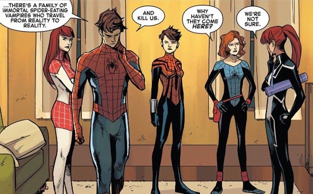 In the case of Araña, however, her body actually starts to look more like the white spider-bodies around her. While some artists continue to draw her bolas, many now illustrate her web-shooters with the same mechanics and style as countless other spider-figures. Her costume as Spider-Girl consists of a “typical” full-body suit and a more “traditional” mask, a far cry from the exoskeleton and goggles she donned before. There is little left to distinguish her from various other spider-women in the multiverse, which becomes even more apparent in the Spider-Girls (2018) mini-series (part of the larger Spider-Geddon event). There, her body and face cannot be easily undifferentiated from the other spider-persons on her team.