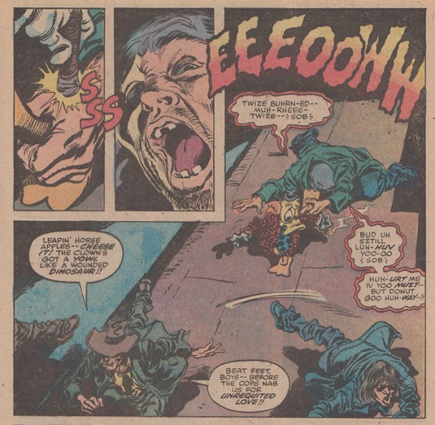 2. The Cover: I like this cover. It not only references an actual scene in the comic (in which Howard goes from bemoaning the attention of a deluded drunk to saving the vulnerable man from a trio of roughs who see them as “easy pluckin’s”), but I love how the dark blue sky, the streetlight, and the perspective evoke the lonely hours of the late night/early morning, even the glint of light on the liquor bottle and the sole Camaro parked on the street give it just the right sense of place and time. There is also a tension between the call-out box—asking “Where do you go– What do you do– The night after you save the universe?”—and the street life scene Howard finds himself in. The expression on Howard’s face—the position of his gloved hand in front of his bill, his eyes wide and peering back—evokes simultaneous fear and embarrassment, a combination that pervades Howard’s adventures among the hairless apes. Furthermore, the cover also brings to mind the frequency with which Steve Gerber writes Howard the Duck as to interact with people on the lowest echelons of American urban society. Perhaps in his role as “Everyman,” Howard encapsulates that sense some people like to have of themselves, as too authentic and practical to be part of the social and/or intellectual elite but also better than common “street people.” At every turn, Howard is put into moral opposition with street people and people on the street. There are many examples: the kids reveling in kung-fu violence and drawing the attention of an actual gang in Howard the Duck #3, the Kidney Lady in Howard the Duck #2 (and beyond), who visually evokes what in the latter half of the last century was insensitively referred to as a “bag lady.” Or worst of all, the racist scene in Howard the Duck #20 that I can’t seem to avoid coming back to, where locals cheer the massacre of black folks who hangout in front of their building. Howard is both a part of and at odds with what can only be described as (given how it is presented in the comic books themselves) a lower social order. He finds himself in greasy spoons and all-night donut shops. He rides cross-country buses with the other poor who can’t afford to fly. If I were creating a Howard the Duck TV show I’d maybe even use 1979’s “Street Life” by The Crusaders (featuring Randy Crawford) as its theme song.