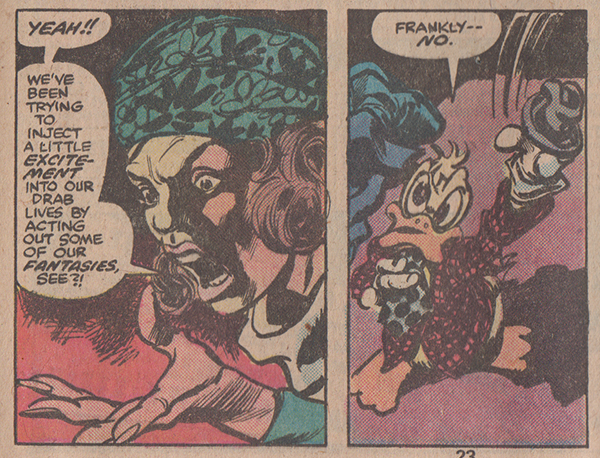 7. Let’s Talk About Sex: Howard the Duck has had some weird sex stuff going on—or at least suggested—since nearly the very beginning of the series. And if you count Bev being kidnapped and put in a chainmail bikini in the first issue as a sex thing—and why wouldn’t you?—then indeed, from the very first issue. Howard the Duck #24 does not ignore that in its recapitulation of the common themes and occurrences of the series. After running into the bag-lady, Howard hears a payphone ringing, and despite his claims not to care about others and objections to being constantly roped into shenanigans, he answers it. It is an obscene phone call (apparently being made by a woman, which seems in line with Gerber’s frequent weak attempts at comic reversal). It feels like a pointless gag to fill up about six panels. This is followed up by the woman Howard spots alone at the bus stop. He walks by her without a second thought but when he hears a scream he runs back thinking, “Should’a realized she’d be a beacon in the night for every–” I am not sure what synonym for creep would have ended his thought because it is interrupted by the sight of the creepster crumpled on the floor. He was the one who screamed. The woman is upset, not because she was attacked, but because the “attacker” was her husband failing to fulfill her fantasy of being subdued and carried back bodily to their apartment. She explains that they’ve tried this every night for two weeks, but every time she resists to heighten the excitement, she ends up clobbering him because he won’t fight back, leaving him a beaten pulp on the sidewalk. The woman—looking a little like Rhoda-era Valerie Harper with headwrap—even invites Howard to take her husband’s place. It turns out that her fetish does not include actual sex but forcing her to dance a fandango. Howard refuses, continuing to wander off to contemplate the meaning of his life and thus of this comic. This couple’s predilections and the pairing of an overbearing/powerful woman with a weak-willed sensitive man is something we’ve seen in Howard the Duck many times. It does not exactly reflect Howard and Bev (though Howard’s jealousy and insecurity regarding Bev does sometimes echo these other examples), but Amy and Elton from issue #19 definitely fit those roles.