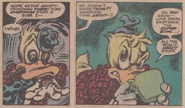 These two single panels from Howard the Duck #24 are among my favorites. It is impressive how much confusion, pity, and consternation Gene Colan is able to pack into the duck’s bill and those eyes.