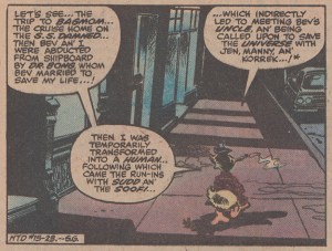 Howard’s late night perambulatory musings conveniently happen to be a summary of Howard the Duck #15 to #23. [Click to enlarge]