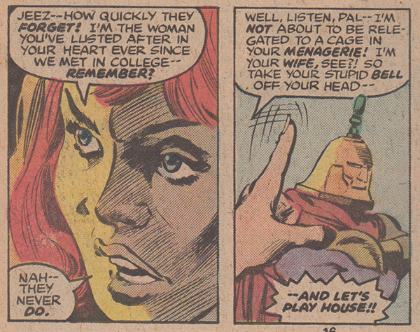 Now awake, but making no mention of the dream’s possible lessons, Howard offers Iris—who is still wracked with guilt—the opportunity to redeem herself by joining him to go after the Circus of Crime, who managed to escape in the commotion at the end of the previous issue. He tells her that her conscience needs him, but if that dream is anything to go by, it seems like his conscience needs to feel like he is doing something, too.