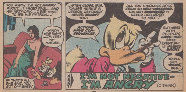 Winda has never made much of an impression on me in my reading Howard the Duck. Basically, she was just the girl with the speech impediment that had KISS come out of her head at an asylum run by Nazi cultists. In these two issues, however, she very quickly became my favorite cast member. In addition to telling off Iris Raritan in issue #26, we get the pleasure of hearing her give her perspective on Paul’s success and her clear delight at the painter’s crush on his benefactor in issue #25. She also has no time for the rude snobs at Iris’s Long Island debut party for Paul, confronting a woman who disgustingly expresses bigoted sentiments about little people­­—“Midgets are such distasteful little creatures — regardless of how they’re attired”—because she thinks Howard is one in a duck suit. Sure, I wish she hadn’t body-shamed the rich ole bag in her retort, but Winda is also consistently the kindest, funniest, and most thoughtful of Howard’s regulars.