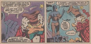 Howard and Iris slip into the audience for the next performance of the Circus of Crime, the latter in a cloak and hood I have a hard time calling inconspicuous, and the former obscured by the much taller crowd. As the show plays out before him in big well-rendered panels, Howard comes to see the circus as “a metaphor for the recent events of his life!” This seems potentially interesting, but like most ideas in Howard the Duck it is not only insufficiently developed but immediately dropped. It is unclear what Howard’s seeing the “graceful elusiveness” of the acrobats, “the meaningless bombast” of the human cannonball, the “lethally seductive dance” of the snake woman, the “implicit deception in the clown’s painted grin” as reflections of his own life is helping him (or us) to understand. There is no substance to this allusion. Instead, as soon as the Ringmaster does his mesmeric hat trick, Howard and Iris are able to look away and Howard snaps some pictures for evidence with a camera he had Iris buy along the way.