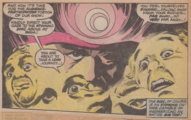 Ignatz and the rest of the circus-goers in Skudge, PA, mesmerized by the Ringmaster’s hat. Great art as usual from Colan and Jansen. (Howard the Duck #26)