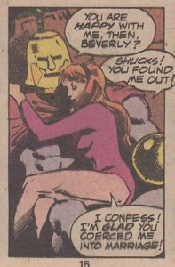 In case it is not clear, it does turn out that Bev does in fact like being Dr. Bong’s plaything. In issue #27, when we return for another glimpse of her domestic life in his Himalayan stronghold, she even says to her captor, “I confess! I’m glad you coerced me into marriage!” This is after the scene in issue #25 when Bev, expressing boredom, demands that Bong “play house” with her (a clear euphemism for sex). Beverly Switzler is (in)consistently written to embody the worst stereotypes of women as disloyal, fickle, and slutty. Sometimes I think that in the figure of Bev, Gerber has inadvertently revealed the incoherence of those stereotypes, by forcing her to be every kind of two-dimensional idea of a woman at once. Perhaps Gerber thought by making Bev confront Bong for sex he was mitigating the rapey implications of their relationship, but it does no such thing. All it does is reinforce the toxic notion that women “really want it” and they just need to be coerced a bit to discover that they like it. In the end, the scene of marital bliss is marred not by these sour implications, but by Dr. Bong’s announcement that in order to regain his dignity, he plans to once again seek out Howard and kill him, since the duck was “the only creature to ever thwart [his] ambitions.” Once again, problems matter when they effect Howard, Bev’s living conditions and what she has had to accept come second, if that high, on the list of narrative priorities.