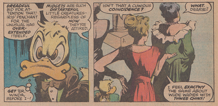 Winda snaps at the snobby old bigot at Iris’s party who thinks Howard is a little person (Howard the Duck #25)