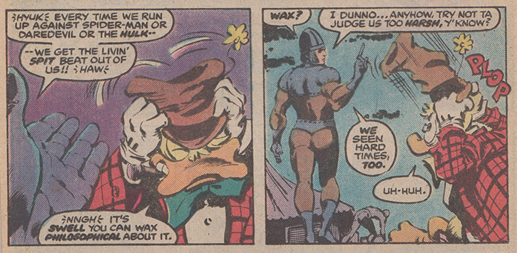 Winda has never made much of an impression on me in my reading Howard the Duck. Basically, she was just the girl with the speech impediment that had KISS come out of her head at an asylum run by Nazi cultists. In these two issues, however, she very quickly became my favorite cast member. In addition to telling off Iris Raritan in issue #26, we get the pleasure of hearing her give her perspective on Paul’s success and her clear delight at the painter’s crush on his benefactor in issue #25. She also has no time for the rude snobs at Iris’s Long Island debut party for Paul, confronting a woman who disgustingly expresses bigoted sentiments about little people­­—“Midgets are such distasteful little creatures — regardless of how they’re attired”—because she thinks Howard is one in a duck suit. Sure, I wish she hadn’t body-shamed the rich ole bag in her retort, but Winda is also consistently the kindest, funniest, and most thoughtful of Howard’s regulars.