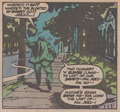 That said, like almost all women in this comic series, the narrative treats Winda terribly. Leaving aside the over the top representation of her mode of speech (with “W” replacing all instances of “L” and “R” without rhyme or reason for how they’d actually sound in real speech—a joke with diminishing returns that becomes frustrating to read and understand), the narrative reward for Winda’s standing up for her friends is an assault by a random wacko in Skudge, PA that has sexual overtones and is clearly depicted as having highly traumatic consequences for the young woman. Immediately after Iris Raritan drives off leaving Winda alone, a “bombed” guy named Lance shows up to harass her. Claiming it is love at first sight and adopting the too frequent discourse of “the nice guy” when she rebuffs him, Lance grabs her and offers to bring her back to his place for a drink. When “Please let go!” doesn’t work to get him to stop, Winda scratches his face bloody. As usual, when such a man reaps the reasonable consequences of his behavior, he reacts with violence. While we don’t get to see what he does to her, the transitional narration explains that “the local lunatic drags a terrified Winda into the shadows…” Between the imagery it evokes of a woman dragged into a dark place and the trauma associated with the assault later when Howard is waiting for news of her and Paul at the hospital after the incident at the gas station, there is definitely a sense that Winda has been sexually assaulted. And I hate it.