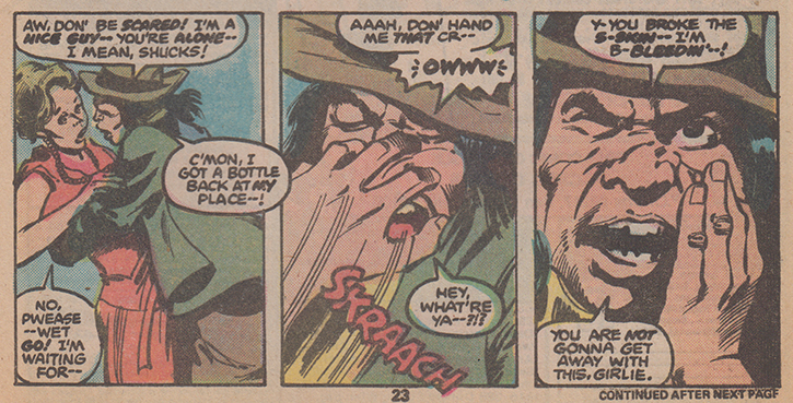 Winda ends up further assaulted by a drunk for trying to defend herself against assault. (Howard the Duck #26)