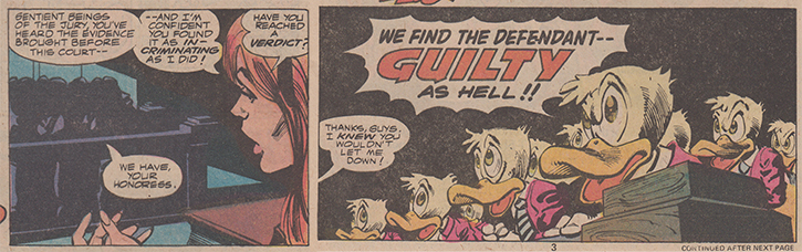 Howard finds himself guilty of “terminal negativism” in his trial dream, even though as a defendant he refuses to accept the verdict (Howard the Duck #27).