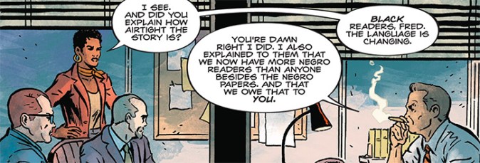 Wardell greets Elena at the diner and refers to her as “the Black Lois Lane” and Miss Henrietta greets Elena at the Hall of Records calling her “our very own Brenda Starr.” From Abbott #1 (January 2018) and Abbott #4 (April 2018). [Click to Enlarge]