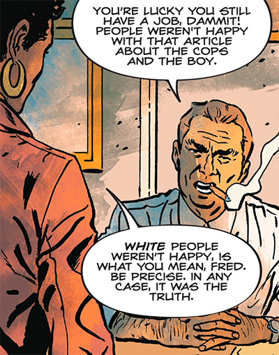 Elena explains to her editor, Fred, and two newspaper board members that her story about police brutality is “airtight.” From Abbott #1 (January 2018).