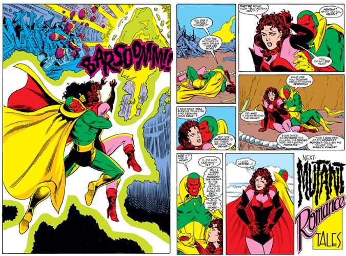 The scene in which Wanda becomes pregnant, in The Vision and the Scarlet Witch vol. 2, #3 (December 1985) by Steve Englehart and Richard Howell, is my all-time favorite moment in the title characters’ relationship. In this scene, Wanda pushes her mutant magic to its limit absorbing and redirecting an outpouring of mystical energy that threatens to destroy the world. The Vision helps by supporting her, catching her in his arms and increasing his mass to hold her steady in a suggestively sexual pose, his pelvis tight against her backside as he throws his head back, mouth agape with passion. Wanda’s arms, meanwhile, stretch toward the phallic shape of Wundagore Mountain, engulfed in a fiery explosion that also engulfs her embrace with the Vision, caressing their joined and straining forms with jagged and sensuous tendrils of green and white fire. The phallic mountain could be reaching for Wanda’s loins. But it’s her power, and her body, that’s corralling and aiming the energy; if there’s a penis (or phallus) here, it’s Wanda’s. The energy finally dissipates into a simmering plume hovering like a post-coital cigarette above the couple’s now tenderly reclining forms. The final panels of this page reveal that Wanda uses the energy she absorbed to magically impregnate herself with twins.
