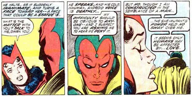 Once the Scarlet Witch/Wanda Maximoff rejoins the Avengers in issue #70 (November 1969), the Vision’s negotiations of authenticity often center on the relationship between masculinity and maleness. In the Vision’s long-simmering on-again/off-again romance with Wanda, emotions aren’t really the issue; the Vision clearly loves Wanda, and she loves him. The problem seems to revolve, instead, around the actualization of love. Interestingly, Wanda doesn’t seem to care about this question; the Vision’s the one who’s worried about his dick. For instance, in Avengers #99 (May 1972), the Vision cites the fact he can’t have children as a reason he and Wanda couldn’t—or shouldn’t—be together. This isn’t a concern Wanda raises at this juncture and is, in fact, a problem she later proves perfectly capable of solving (I’ll return to this momentarily). Of course, an inability to have children doesn’t mean the Vision doesn’t have a penis. But given the already-unstable nature of his body, it does raise further questions. As does an incident in Avengers #105 (November 1972) involving the supervillain Lorelei, in which the Vision proves immune to the seductress’s supposedly irresistible charms. Though his immunity allows the Vision to save his teammates, it wreaks havoc on his personal life, by severely damaging his belief in his ability to have one. After the Lorelei incident, the Vision reverts to an “inanimate” or “statue”-like state. When he finally answers Wanda’s frantic pleas to tell her what’s wrong, “his cold, inhuman, android voice is deathly” as he says, “My difficulty should be obvious to anyone—and I suspect you are asking to hear me deny it. But no. Though I am constructed in the semblance of a man… it seems only humans may be affected by… love.” The first word of the next panel characterizes the conclusion of the larger plot as an “anticlimax.” Wanda and the Vision’s romance isn’t directly implicated, but the use of this particular word in this particular place is suggestive, nonetheless.