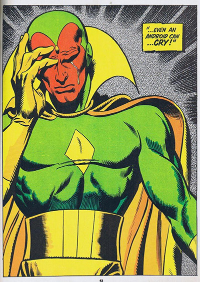 After a lengthy and emotionally fraught investigation of the Vision’s complicated backstory, the Avengers accept the formerly villainous android’s petition to join them. Before responding, the Vision excuses himself, retreats to the privacy of the next room, and dramatically weeps, accompanied by a caption declaring, “…even an android can… cry!” Interestingly, the caption is spoken by Hank Pym, addressing the other Avengers. Thus, while the Avengers let the Vision cry privately, they know he’s doing so. They know because they understand; most of these heroes have done their own crying. Indeed, the Vision’s emotionalism is emblematic of Marvel’s trademark incorporation of romantic melodrama into its superhero stories. The Vision’s android status, however, particularly highlights the subversive potential of this generic hybridity. In an essay focusing on this splash page titled “Even an Android Can Cry” (2010), Tim Nelson characterizes the Vision’s tears as both authentic and critical: “Vision cried because he found acceptance despite his artificial creation. It might not be so mischievous to suggest that the android was also crying because… the masculinity conferred upon him was a sham” (256). This was, not coincidentally, also the moment I first fell in love with the Vision. What’s not to love, as a feminist female fan, about a male android who cries—an artificial man rejecting his phallocentric programming with an improbable leaking that’s not propulsive but rather intensely sensual, his single, dribbling tear framed by an elegant hand while breaking perfectly on his graceful cheekbone? The Vision doesn’t just cry—like the similarly high-cheek-boned women adorning the covers of so many romance novels and comics, he looks pretty when he’s crying.