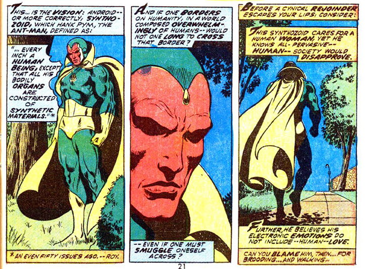 Yes, not showing the Vision’s penis preserves its mystique. But for me, this mystique is less the promise of phallic power than the promise of something resistive. Let’s circle back to that origin story from Avengers #58. In this version of the Vision’s origin (it’s changed several times over the years), he’s created by the supervillainous robot Ultron, himself created by Hank Pym. So already, the Vision is a copy of a copy, a rebellious son of a rebellious son. But the reproductions don’t stop there. The Vision’s brain patterns—which are responsible for his ability to resist Ultron’s programming and his capacity for emotion—are copied from then-deceased supervillain-turned-ally Wonder Man. The Vision is a work of gender in a story of mechanical reproduction; thrice a copy, he lacks an aura of authenticity. And yet, as Nelson observes, his ability to cry is presented as “proof of humanity and authenticity” (256); his tears both respond to his inauthenticity and bely it. For much of the three decades that followed, the Vision would continue to negotiate this contradictory and perpetually unstable authenticity. His penis is routinely central to these negotiations.
