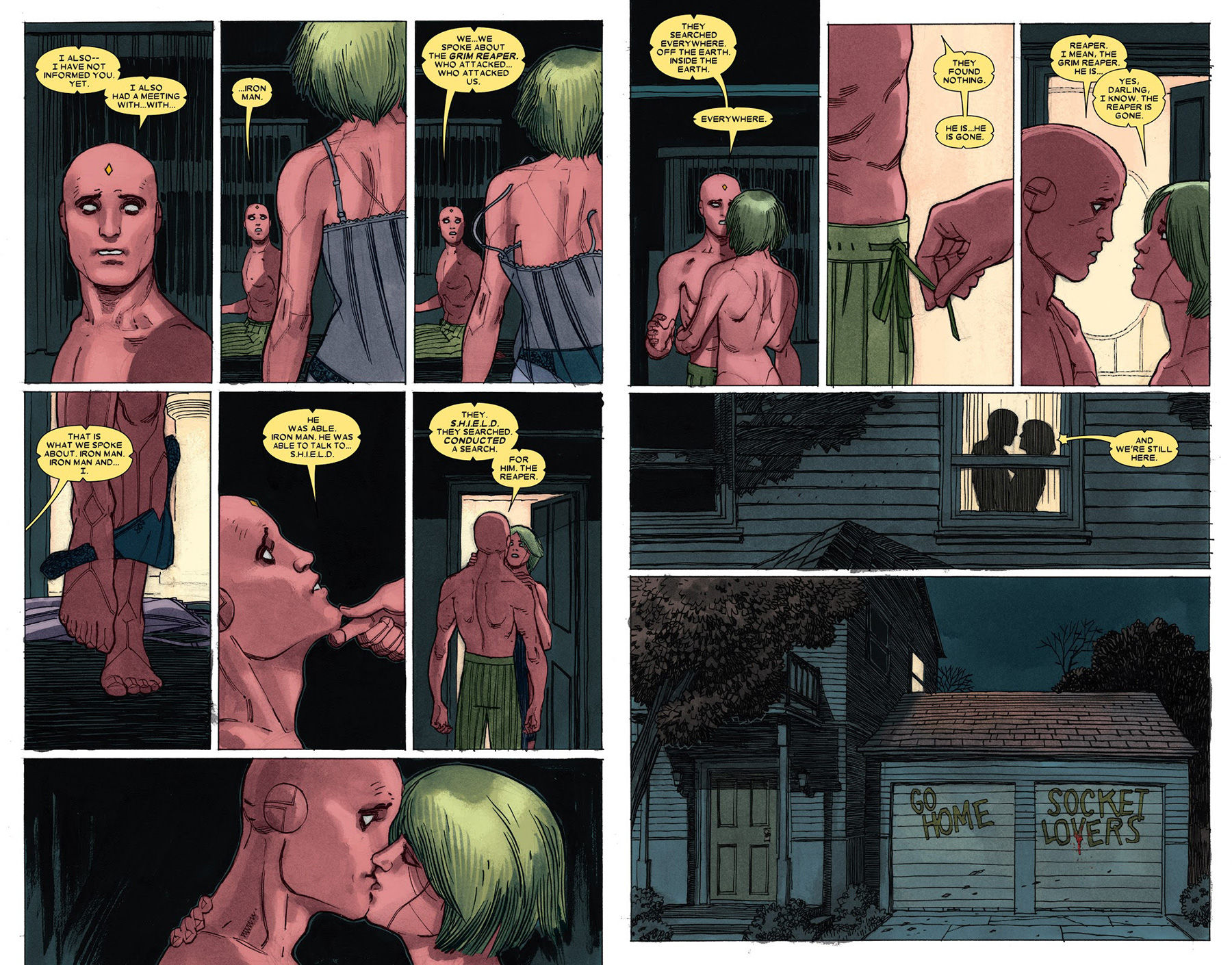 The dissolution of Wanda and the Vision’s relationship and family would go on to have wide-ranging consequences. In 2004’s “Avengers Disassembled” and 2005’s House of M, the return of repressed memories of her children causes Wanda to lose control of her powers, resulting in the deaths of the Vision and Hawkeye and the decimation of the mutant population. I try to rationalize Wanda’s actions in these stories as a form of feminist revenge; the dismantling of Wanda and the Vision’s family must have been a lousy creative decision to be capable of wreaking such havoc. But in my heart, I can’t get past the implications of this dismantling. My favorite romantic moment in the life of my favorite superhero couple is now indelibly associated with evil, madness, murder, and even genocide. For all its other virtues, Tom King and Gabriel Hernández Walta’s The Vision, winner of the 2017 Eisner Award for Best Limited Series, doesn’t solve this issue. To enact his deconstruction of the suburban nuclear family, King frames the Vision’s desire for domesticity as deeply flawed and adds a new element of toxicity to his relationship with Wanda. In this series, the Vision creates a “perfect” android family, while using Wanda’s brain patterns to construct his wife, tellingly named Virginia. Apparently, Wanda gives him permission to do this. It’s unclear, however, whether Virginia would have been capable of consenting to her marriage at the time of her creation. Virginia’s (initial) subservience is additionally disturbing. The Vision I fell in love with didn’t want a subservient wife; he wanted a superheroic partner whose passion inspired his own, and whose power he openly acknowledged as superior to his. And he certainly wouldn’t want a virginal wife, or be flustered when that wife seduces him, pulling him to bed by the waist of his pajama pants.
