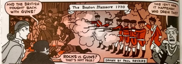 Nathan’s original narration of the Boston Massacre in the primary narrative of Nathan Hale’s One Dead Spy (26).