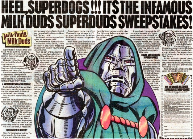 The advertisement’s one-page strip gives a limited range of information, but most of these components are also present in the concurrent issue of Captain America. The use of cakes is absent, but then so are Nick Fury and the Trapster, and it would be entirely reasonable for readers to accept that not all components would appear in every story. Similarly, the version of Doctor Doom in the Milk Duds advert has an attitude that is broadly consistent with the one in the main comic, calling superheroes “dolts” and commanding his followers to “heel,” and, although he does not do so in the main text of Fantastic Four #200, it would not be impossible to imagine him using a candy competition as a front for a nefarious scheme.