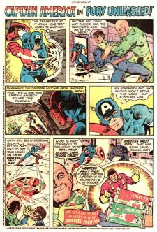 Comics characters have a long history of being used for advertising purposes, perhaps most famously in the long-running series of advertisements for Hostess fruit pies, in which superheroes thwart evildoers through judicious use of processed confectioneries. A great example of this appears in “Fury Unleashed,” a strip which was published in Marvel comics dated April 1982. In it, Captain America realizes that neither his shield nor his superhuman strength can save Nick Fury, so instead he throws Hostess fruit pies at his friend’s captor, distracting him long enough for the heroes to escape. However, when Cap faces a similar scenario in Captain America #268, published that same month, he chooses to surrender himself to save his friends rather than simply providing a dessert option for his enemies.