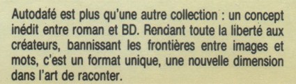 Both the American and the French series’ peritexts develop analogous argumentation about the intrinsically innovative nature of the “graphic novel” and of their new editorial ventures. For example, the introduction to the first issue of Fiction Illustrated heralds itself as “proof of this coming of age of the American comic book,” while the afterword in the fourth issue claims the series is “some advancement for the graphic story medium in America.” In a similar manner, the back cover blurb for the whole Autodafé series calls itself “a new dimension in the art of storytelling.” The “graphic novel” label is meant to mark an ambition, in aesthetic terms as well as in social and cultural status.