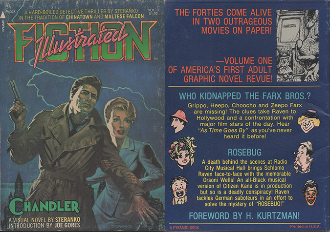 Left: The cover to Fiction Illustrated vol. 3 (Pyramid Books, August 1976). Right: the back cover to volume 1 (ibid., January 1976), which calls the publication, “America’s first adult graphic novel revue.”