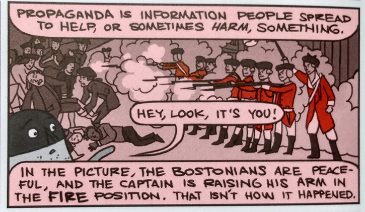 In the mini-comic “Crispus Attucks,” however, the titular character provides a counternarrative to Nathan’s white-centric telling of the Boston Massacre. In the main comic, Nathan narrates the shooting, represented in a panel that reproduces Paul Revere’s famous engraving. Attucks’s crumpled corpse appears at the bottom of the panel, surrounded by a bright red pool of blood. During Nathan’s narrative, none of the white characters identify Attucks or even acknowledge his presence, reducing the man to a silenced, bloody spectacle. Significantly, an almost identical panel also appears during Attucks’s later recounting of the Massacre in the mini-comic. Here, a secondary character ensures that the audience notices Attucks’s presence by intruding in the frame of the panel to exclaim, “Hey, look, it’s you!” (Hale 126). Notably, the lurid pool of blood has also vanished from this re-rendering. In contrast to Nathan’s narrative, then, this paratext explicitly identifies Attucks and enables him to narrate his own death with less sensationalized imagery. As a result, the mini-comic complicates Nathan’s initial portrayal of the event by revealing the presence of an alternate, previously overlooked perspective. This re-centering of the narrative introduces children to a marginalized viewpoint that may not appear in their history textbooks and tacitly asks readers to consider whether Nathan’s story—and, by extension, history at large—has omitted other voices.