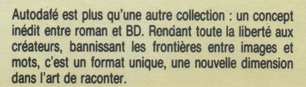 The back cover blurb featured on all Autodafé volumes expresses a similar positioning logic in the use of the “graphic novel/roman graphique” label. But the frame is different: distinctions are made not within the comics field (as it is for Fiction Illustrated) but at its borders. “Autodafé is more than just another series: an original concept between novel and BD [bande dessinée]. Giving complete freedom to creators, banishing the boundaries between images and words, it is a unique format, a new dimension in the art of storytelling” (my translation and emphasis). The Autodafé series tries to move the lines between the comics field and the literary field and to posit the “graphic novel” as a new third space, defined as a crossroad of formal text/image experimentation. For Fiction Illustrated, the “graphic novel” label was a means to help comics find a place in bookstores. In France, where comics already were in bookstores, the label was a means to find another place in bookstores.