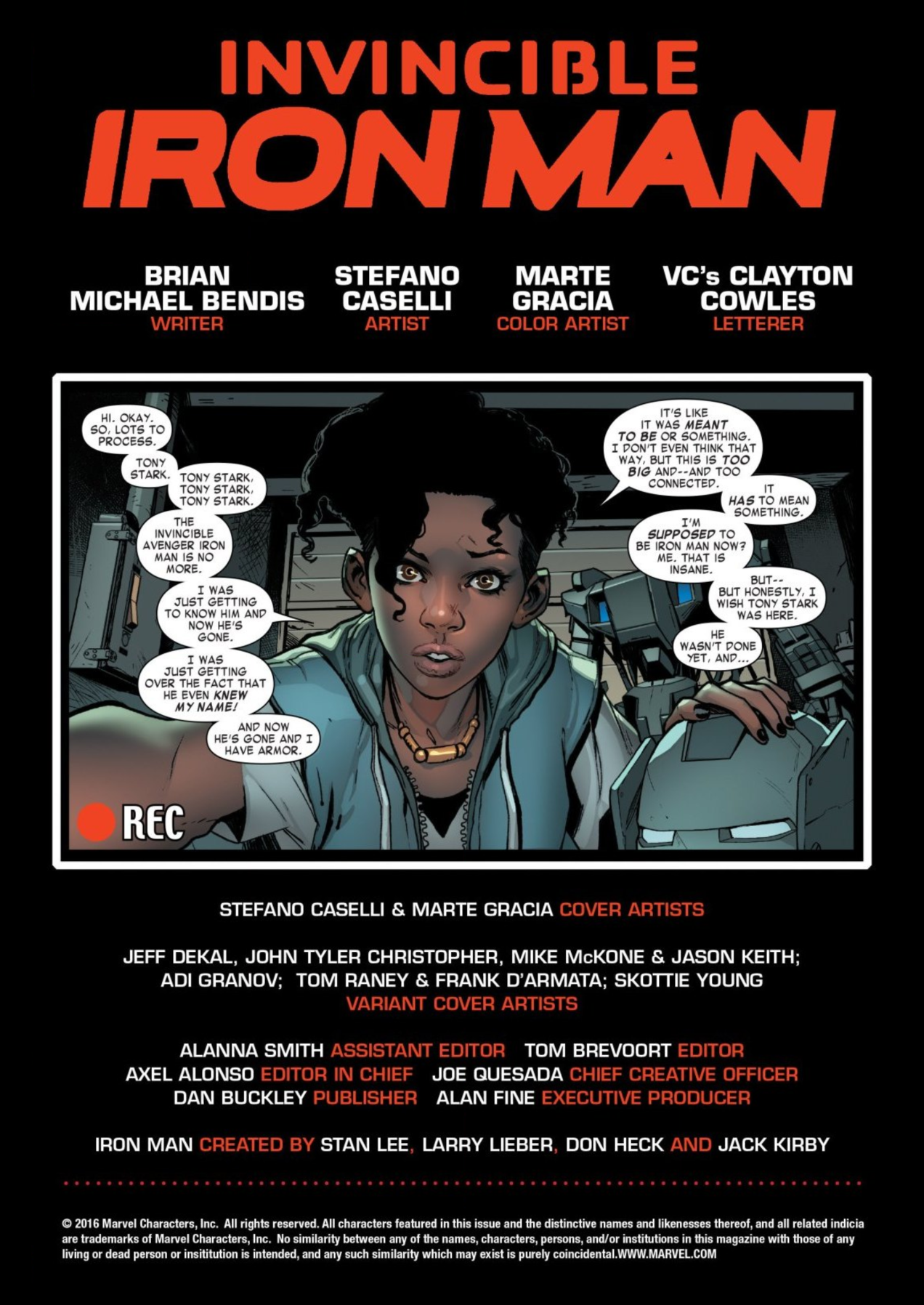 Riri’s vlog. Invincible Iron Man vol. 4, #1 (January 2017). words by Brian Michael Bendis. art by Stefano Caselli and Marte Gracia. Letters by Clayton Cowles). [click to enlarge]