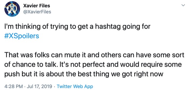 The highly active #XSpoilers hashtag was created by fans not the official Marvel twitter account. This tweet from Xavier Files, which reads, “I’m thinking of trying to get a hashtag going for #XSpoilers / That was folks can mute it and others can have some sort of chance to talk. It’s not perfect and would require some push but it is about the best thing we got right now.”