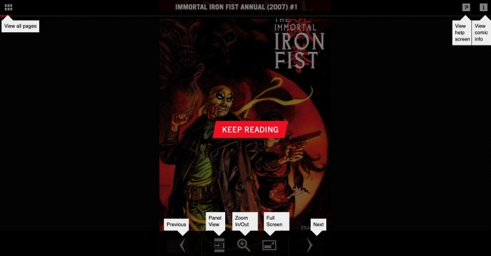 Take, for example, Marvel’s The Immortal Iron Fist Annual #1 (2007). Even the annum of this “Annual” special is distorted by digital paratextuality. There are multiple channels through which to view this comic online, including the Marvel Unlimited (MU) web portal and readcomicsonline.to (RCO). These two ways of reading online demonstrate myriad schisms in paratextual material: MU has a Help function as well as an info panel telling you the comic’s publication date, the date it was added to the Marvel Unlimited service, the imprint, creators, and a synopsis of the issue. The RCO version, meanwhile, is populated with all sorts of ads. Which are “true” paratexts? It may seem simple to surmise that the MU version must lie closer to the truth, but the info panel erroneously suggests that the comic was published in 2016. The RCO version’s cover image suggests a publication date of 2012, but this too is incorrect, which clicking ahead to the next page reveals.