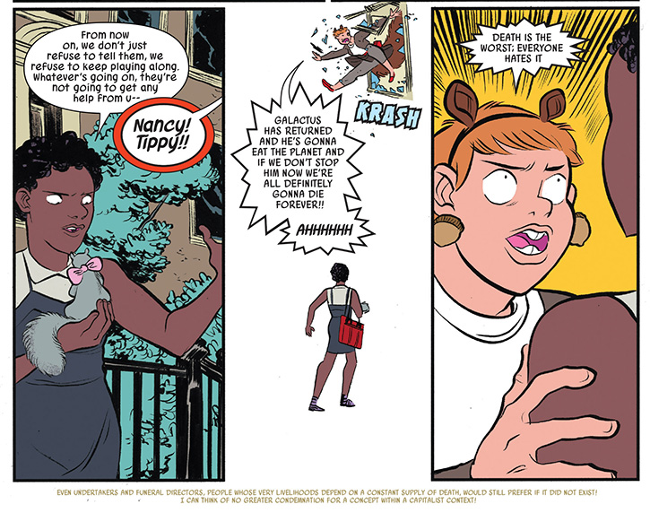 By analyzing a random issue of Squirrel Girl chosen as a case study of a typical example of the comic’s use of paratext, seeing how alt text helps make younger readers feel like experts and active participants becomes apparent. USG vol. 2, #27 (February 2018), includes 20 story pages of which 16 have bottom-of-page messages. On page one, Squirrel Girl (Doreen Green) and her squirrel sidekick Tippy-Toe are reminiscing about their earlier encounter with Galactus. Doreen says “You go first. And let’s not leave out one single detail.” The alt text reads “Wow, what a weird thing for Squirrel Girl to say! Ah well, I’m sure everything’s completely fine and normal.” This text acts as ironic foreshadowing, implying that things aren’t fine and that Galactus will soon become highly significant. On the next page, Doreen’s roommate Nancy encounters further references to Doreen’s battle with Galactus, and the alt text references the alt text on the previous page: “WHY ARE THINGS NOT FINE AND NORMAL?” Subsequent alt texts have different functions. On page three, Nancy takes a physics test, and the alt text discusses a silly thing North did when taking a similar test. The alt texts on pages four and five are written in the voices of characters on those pages—respectively, a taxicab driver and Doreen—but these texts don’t represent the characters’ actual words. Rather, they represent humorous extrapolations of the things the characters say on the page. On page five, Doreen shouts “DEATH IS THE WORST, EVERYONE HATES IT” and the alt text i imagines Doreen thinking that even undertakers and funeral directors hate death, although their jobs depend on it. These alt texts help readers feel that they have an even more intimate access to the characters’ thoughts than is provided by the thought balloons because they often allow for deeper, if tangential, glimpses into a character’s psyche.