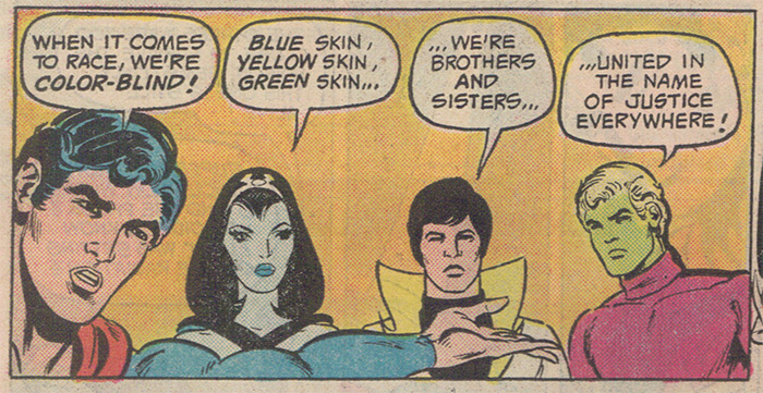 This confusion is explicitly depicted after Superboy and the Legion defeat the bad guys and rescue Tyroc and his city. Marzal’s champion declares, “You went out of your way to save my life…even though we’ve shown you nothing but hatred and contempt!” Superboy explains, “When it comes to race, we’re color-blind!” Shadowlass and Karate Kid add, “Blue skin, yellow skin, green skin…we’re brothers and sisters…” Tyroc is convinced! Realizing he’s been “wrong about a lot of things,” he agrees to return to Metropolis with the heroes to see if he qualifies to become a Legionnaire. “Long live the Legion!”